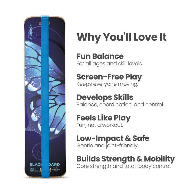 Let your imagination take flight with our enchanting blue Butterfly SlackBoard! Crafted with vibrant blue hues and shimmering iridescent details, this design captures the magic of a butterfly wing. This balance board will spark joy and wonder with every balance training session.